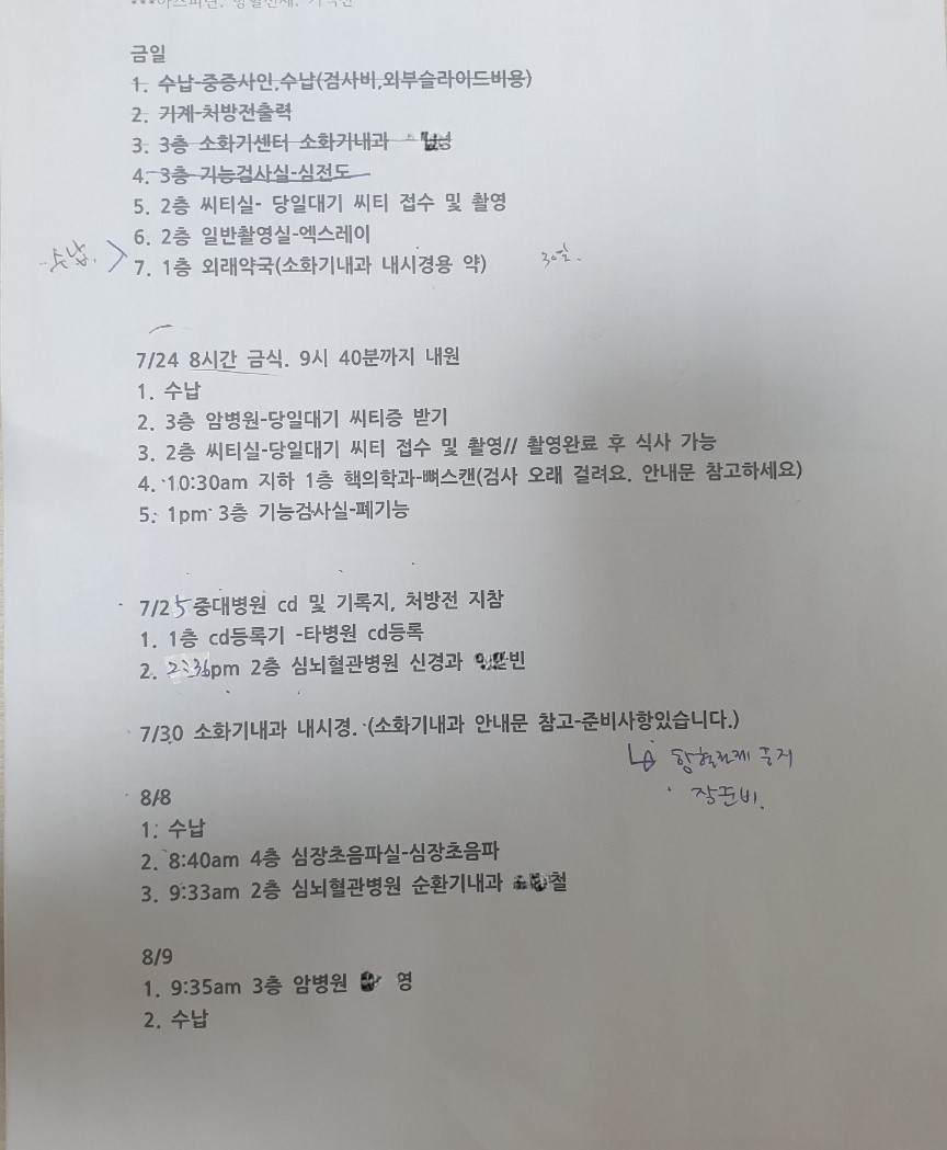 성모병원에서 오전 일정을 마치고 중앙대학교광명병원으로 이동을 하였습니다. 각종 검사일정이 무려 5일이나 잡혔고 수술여부가 확정되지 않은 상태라서 앞으로 일정에 대한 막연한 두려움이 느껴졌습니다. 수술은 언제쯤 가능한 건지, 수술을 할 수는 있는 건지, 지금 상태가 얼마나 심각한지 등 첫 외래 진료에서는 아무것도 알 수가 없었습니다. 거기다 의료파업의 영향인지 몰라도 성모병원은 왠지 모르게 사람이 정말 많고 간호사들은 정말 피곤해 보였습니다. 모두가 제 컨디션이 아닌 것처럼 보였습니다.