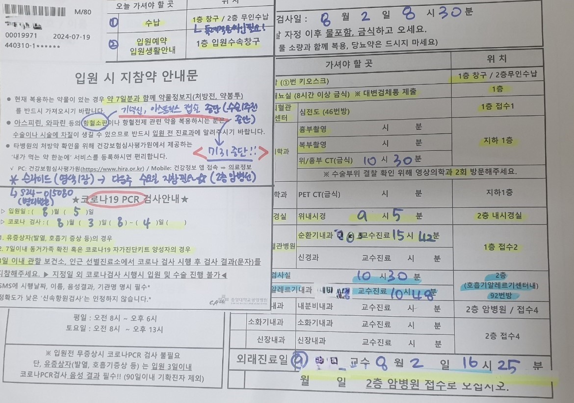 오전에 성모병원에서 경험치가 쌓여서 그런지 중대병원 일정은 수월하게 이어나갔습니다. CD등록하고 초진창구 접수하고 암병원을 방문해서 간호사와 먼저 상담을 진행하고 교수님 상담을 기다렸습니다. 앞에 상담이 지연돼서