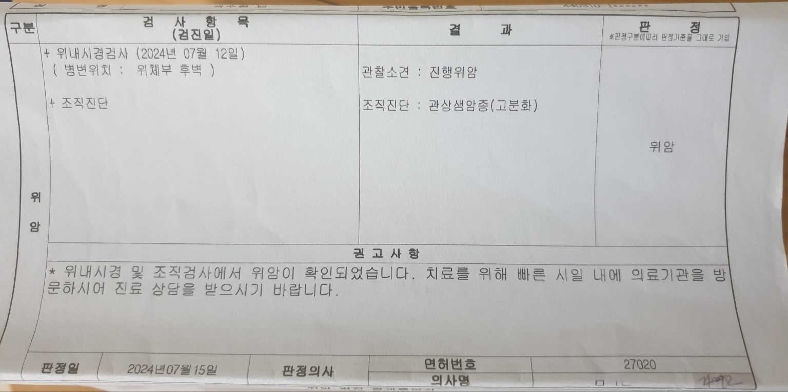 아버지와 둘이서 살고있는 저는 2024년 7월 12일 집에서 아버지를 마주하고 암이라는 소리를 들었을 때 제 귀를 의심하지 않을 수 없었습니다. 바로 검진받은 병원에 전화를 걸었고 내시경 소견으로 암이 맞다는 대답을 들었습니다. 추가로  조직검사 결과는 7월 18일에 나온다고 하였습니다. 이때부터 벌써 심장이 두근두근 뛰는데 기분이 정말 표현할 수 없는 절망감이 들었습니다. 아버지는 의사가 헛소리를 한다며 처음에 믿지 않는 눈치였습니다. 물론 저도 오진이길 바라는 간절한 마음이었습니다. 그렇지만 어쨌든 최근 의사파업으로 인해서 빠르게 움직여야 한다는 생각이 들었습니다.