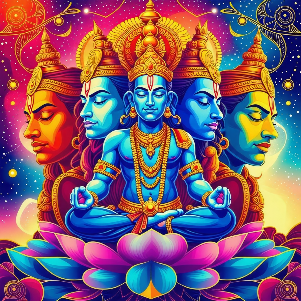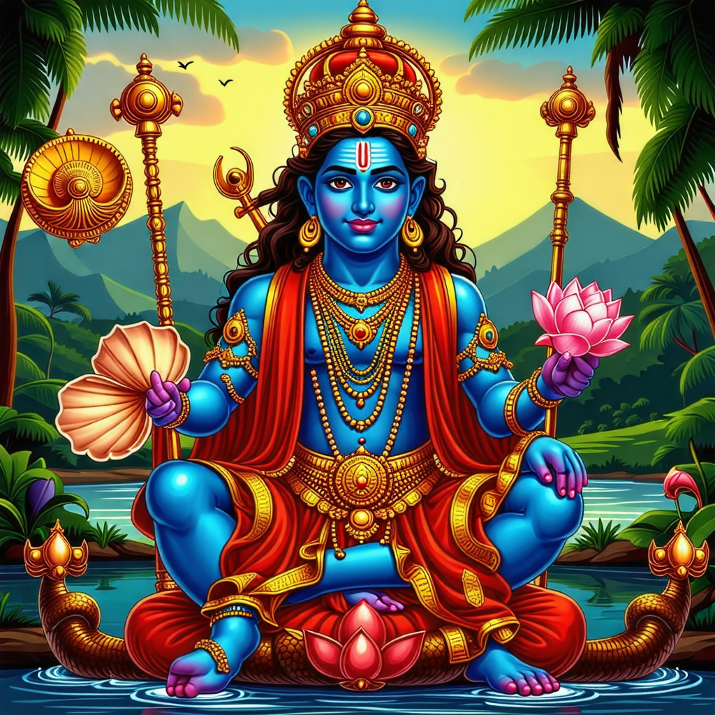 비슈누는 우주의 질서를 유지하는 신으로, 그의 역할은 세상의 조화와 균형을 지키는 것입니다. 그는 일반적으로 파란색 피부를 가진 모습으로 묘사되며, 여러 가지 아바타(화신)를 통해 인간 세계에 나타납니다. 가장 유명한 아바타로는 라마와 크리슈나가 있습니다. 비슈누는 세상의 악을 물리치고, 정의를 세우기 위해 다양한 형태로 나타나며, 그의 이러한 행동은 많은 신화와 전설에서 다루어집니다.