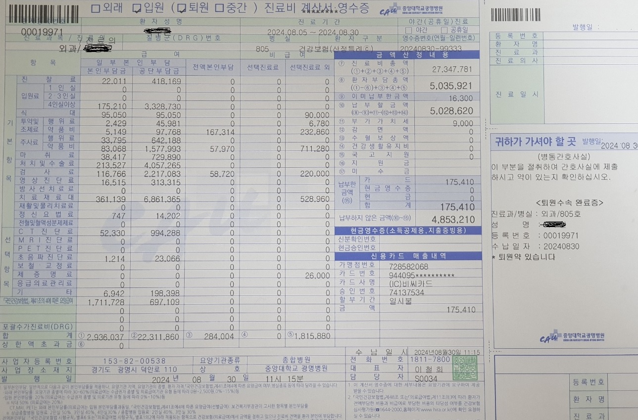 말 그대로 어마어마한 비용에 솔직히 조금 놀랐습니다. 8월 5일부터 8월 30일까지 약 25일 동안 입원을 했었고 수술 말고도 중간에 여러 가치 처치가 있었지만 이렇게까지 많이 나오는 줄은 몰랐습니다. 하지만 우리나라 국민이라면 산정특례 제도의 혜택으로 총 진료비의 급여 부분 95%를 건강보험에서 지원해 줍니다. 아버지의 경우 지원비용이 약 2,200만 원이나 되었습니다. 나머지 본인부담금은 진료비 급여 부분 5%에 더해서 비급여 금액 전액이 환자 본인 부담 금액입니다. 아버지는 약 500만 원의 결제가 필요했지만 이마저도 병원 내 사회복지사의 도움을 받아 군포시청에 긴급의료비지원 신청 후 해결하였습니다. 중요한 점은 긴급의료비지원은 처음 병원 입원하는 시점에 상담을 받으셔야 합니다. 아무래도 나라에서 하는 일이다 보니 절차와 시간이 필요합니다. 아버지의 경우 일반적인 경우보다 오래 입원하시면서 생각보다 많은 진료비가 나왔고 이에 따라서 1회 최대300만원의 지원금에 추가로 300만 원이 더 지원됨으로써 실제로 결제할 금액은 약 17만 5천 원뿐이었습니다. 물론 모든 사람이 지원을 받을 수 있으면 좋겠지만 아버지처럼 수입이 없고 재산이 없는 분들의 경우에만 지원받으실 수 있다고 보시면 됩니다. 보건복지부 지원 기준과 경기도형 긴급복지 기준이 조금 다르게 보이는데 아버지는 간병인 비용도 약 200만 원 정도 지원받으셨기 때문에 경기도형 긴급복지에 해당된 거 같습니다. 참고로 간병인 지원금액은 하루 일당 13만 5천 원으로 계산하고 15일 동안 사용한 비용입니다.